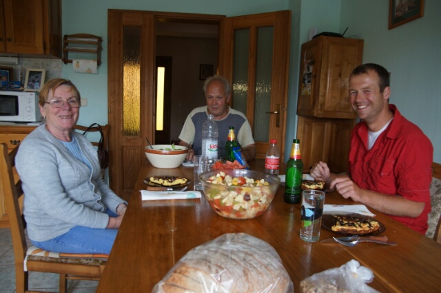 Maar de zon ging voor ons schijnen toen we bij een volgende Warm Shower kwamen: Madam Petrovic, een Française wier Kroatische echtgenoot is overleden. Zij woont op hun boerderij in Ratkovica. We zouden één nachtje blijven, maar het werden er drie! Wat boffen wij dat we zulke warme en gastvrije mensen als Madam Petrovic mogen ontmoeten. We hebben het erg gezellig gehad met haar en Joe, een Amerikaan die via workabroad voor haar een nieuw kippenhok maakte. Hij sprak Engels en Frans, zodat we met z’n vieren aardig konden communiceren. We kwamen helemaal bij op de boerderij. De tweede dag bakten wij Kaiserschmarnn en maakten we fruitsalade. Madam Petrovid en Joe smulden ervan.