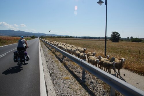 Direct na de grens was zichtbaar waar dit geld heen is gegaan, mooi asfalt en zelfs een afzonderlijk fietspad. Bij elke kruising afgebakend door twee paaltjes, zodat ander verkeer er geen gebruik van kan maken. Wij kiezen ervoor de hoofdweg te gebruiken, omdat er veel losse steentjes op het fietspad liggen. Na een kilometer blijkt dit ook de beste keuze, want een schaapherder gebruikt het volledige fietspad om een kudde schapen over te leiden. Ik had het idee dat er nog nooit een fietser gebruik van heeft gemaakt, maar blijkbaar is het in Brussel makkelijker om geld te krijgen voor een fietspad, dan voor een schaapspad.