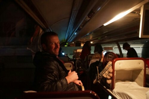 Al snel werd duidelijk dat deze busreis een ander kaliber had dan onze sleeperbusrit. Het middenpad was al smerig van gesmolten sneeuw, maar dit gaf een aantal al snel een vrijbrief ook in het middenpad te spugen. Sommigen gebruikte wel de prullenbakken, maar geregeld werden deze gemist.