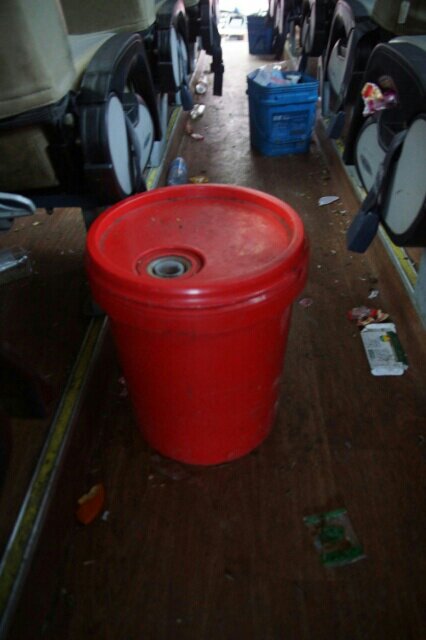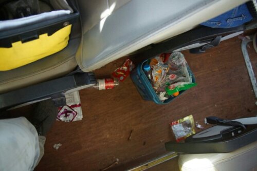 De beenruimte in deze bus was helaas beperkt, maar doordat ik in het gangpad zat kon ik die ruimte gebruiken. Naarmate de rit vorderde werd echter het gangpad ook steeds meer als vuilnisbak gebruikt.