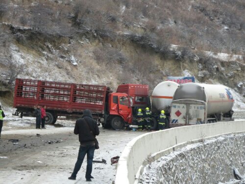 Na de tweede nacht bleef de bus ’s nachts een tijdlang stilstaan. Er bleek een ongeluk gebeurd te zijn. De snelweg hadden we al lang verlaten en we zaten ergens op een bergweggetje. Bij het ongeluk waren twee tankwagens en een gewone vrachtwagen betrokken en de weg was compleet versperd. Medepasagiers gingen telkens staan (soms op hun stoel) om te kijken wat er aan de hand was. Uiteindelijk heeft het meer dan vijf uur geduurd. Twee bestuurders bleken om het leven te zijn gekomen. Nadat de brandweer na drie uur arriveerde, werd met sjorbanden en handkracht de gewone vrachtwagen weggetrokken. Een tankwagen kon op eigen kracht (met een lekke dieseltank) wegkomen en de andere werd weggesleept. Na vijf uur mocht het tegemoetkomend verkeer weer rijden en hadden wij de hoop dat wij ook afwisselend zouden mogen. Niets was minder waar, wij moesten wachten tot al het verkeer van de andere kant gepasseerd was.