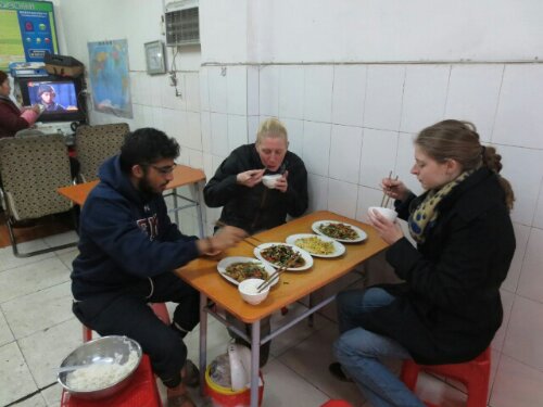 ’s Avonds kwam Sonja’s collega Shri terug van zijn vakantie en hij nam ons mee naar een andere toko, waar hij verschillende gerechten bestelde: aubergine, omelet met bosui, tofu met groenten en gebakken aardappel met prei. We worden steeds handiger in het eten met stokjes, dus de rijst belandde ook echt in onze mond in plaats van op tafel.