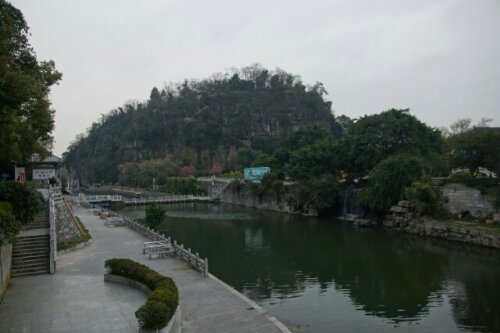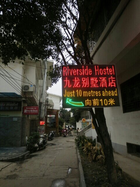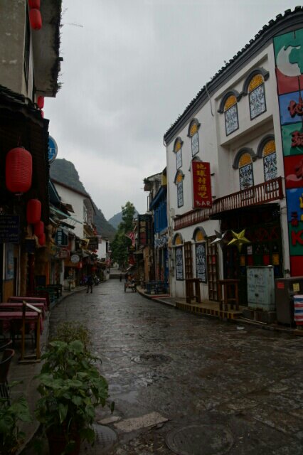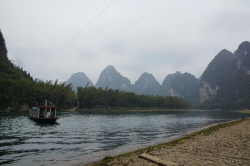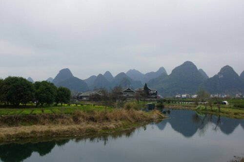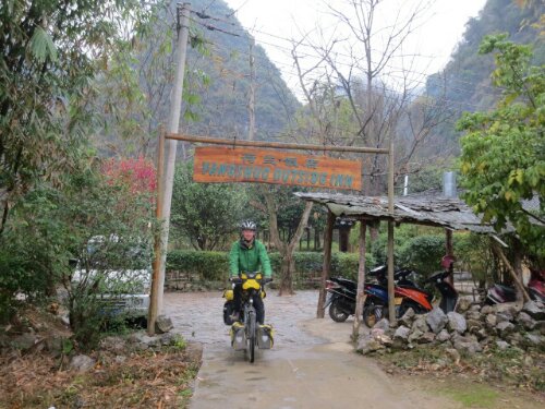 Toch een beetje jammer dat het zwaarbewolkt is en dat een zonnetje de velden niet met wat stralen beschijnt. Na die ene klim volgen er nog wat lichte stijgingen en dalen, maar echt zwaar wordt het niet meer. Halverwege de middag komen we in Guilin aan. We nemen een kamer in het gezellige Riverside hostel.