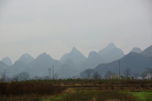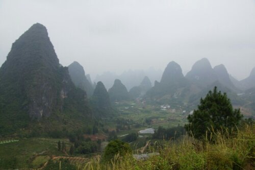 We gaan op weg naar Yangshuo. Er zijn twee mogelijkheden: Franks route via de bergen en mijn route via de G321, dus de provinciale weg volgen. Omdat ik op een door Frank gevonden blog gelezen heb dat zijn route niet helemaal verhard is en daardoor modderige taferelen kan opleveren en omdat ik niet fit ben, wil ik graag via de recht-toe-recht-aan-route fietsen. Frank wil liever de door hem zorgvuldig uitgezochte route door de bergen, maar hij gaat uiteindelijk akkoord. Het is misschien minder spannend, maar het is ook een mooie route langs de Karstbergen.