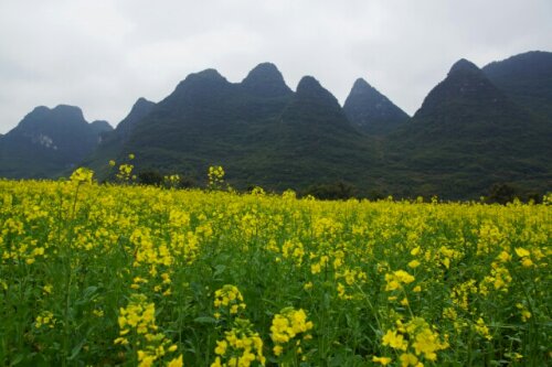 Het allerlaatste stuk van Baisha naar het guesthouse gaat over landelijke weggetjes door koolzaadvelden en om ons heen zijn de Karstbergen; het is schitterend.