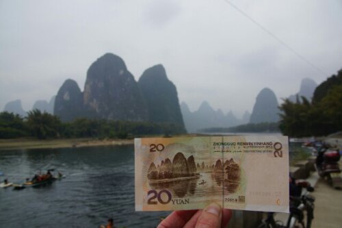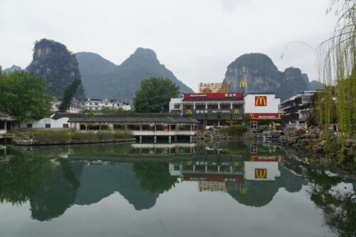 In Yangshuo doen we wat boodschappen en genieten van een Amerikaanse maaltijd. Wat boffen we weer -:). Te meer omdat Franks favoriete burger in de aanbieding is: slechts 10 yuan (€1,25). Jammie! Daarnaast is dit misschien wel de mooiste locatie van MacDonalds: tussen de puntige Karstbergen aan het water, je ziet beide weerspiegelt, heel idyllisch.