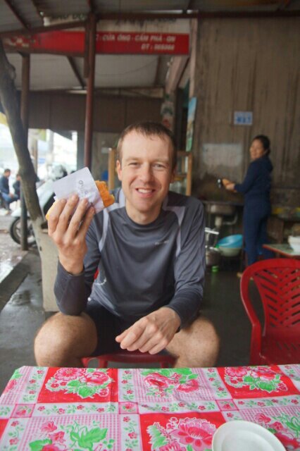 Onderweg merken we al snel de eerste verschillen met China. De mensen zwaaien naar ons. Zeggen ‘ hello’. De toiletten bij de benzinepomp zijn schoner. Er zijn insecten! De luchtvochtigheid is een stuk hoger, maar het is er ook warmer. En we moeten opletten wat dingen kosten. Ons eerste flesje cola kost 10.000 VND (0,35 euro) maar op de volgende plek willen ze opeens het dubbele hebben. Mede door de verhalen van de Lonely Planet dat je geregeld opgelicht kan worden, zijn we een beetje paranoide. Na drie restaurantje afgeslagen te hebben (achteraf redelijk geprijsd) eten we uiteindelijk allebei twee broodjes omelet. Heerlijk! Wel sneu was dat het vrouwtje niet zo behendig was in het roosteren van de broodjes, zodat er uiteindelijk twee zwartgeblakerde opnieuw gemaakt moesten worden.